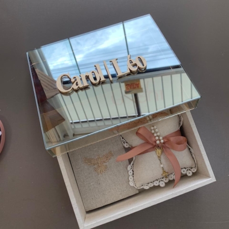 • Convite Padrinhos Acrílico 2 Xicaras com pires e vela aromática almofada com terço.